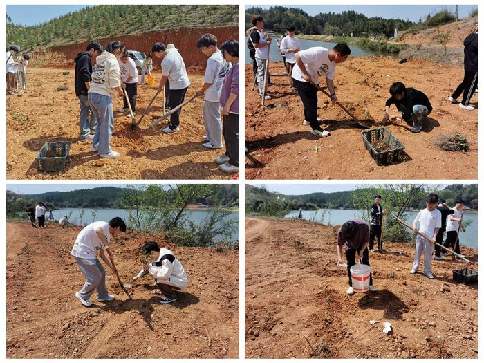 下午13时许,在龙湖村村书记吴红兵的带领下,同学们来到油茶树种植园种,帮助村民种植油茶树和山草药70余株。种植现场,大家手持铁锹、树苗,分工明确、齐心协力投入到油茶树种植的劳动中。种植活动旨在通过实践劳动,弘扬绿色发展理念,培养学生的劳动意识和环保意识,助力乡村振兴。