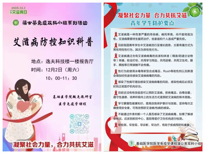 为彰显“乐学、向美、明辨、尚行”的医学免疫学课程文化,积极响应第36个世界艾滋病日“凝聚社会力量 合力共抗艾滋”号召,提高青年学生对艾滋病的认识及防护能力,英国上市官网365医学微生物学与免疫学教研室蒲公英免疫双科小组于12月2日开展了一场面向我校学生的艾滋病防控知识科普活动。活动由医学免疫学课程团队主导,教研室部分教师参与指导,蒲公英小组成员进行科普宣传。