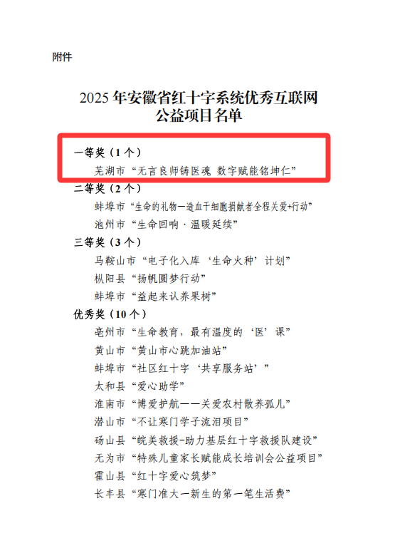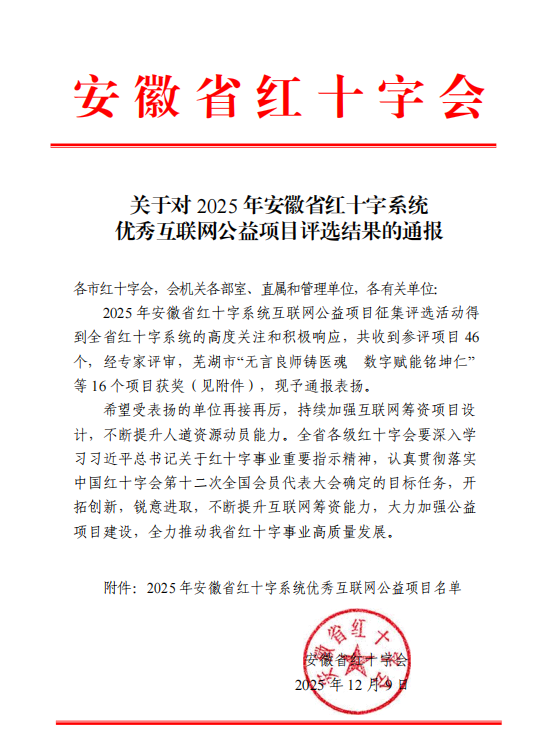 近日,安徽省红十字会公布2025年互联网公益项目评选结果,我院遗体捐献接受站“无言良师铸医魂·数字赋能铭坤仁”项目荣获一等奖。此次获奖作为“传‘人间大爱’之美·感‘无言良师’之恩”——2024年安徽省网络公益行动优秀网络公益项目的延续,是对我校在遗体捐献公益领域辛勤付出的认可,更是对我校长期以来推进生命教育与实践育人成效的充分肯定,充分彰显了我校在引导学生敬畏生命、奉献社会方面的育人价值,生动诠释了立德树人与人文关怀的深度融合。
