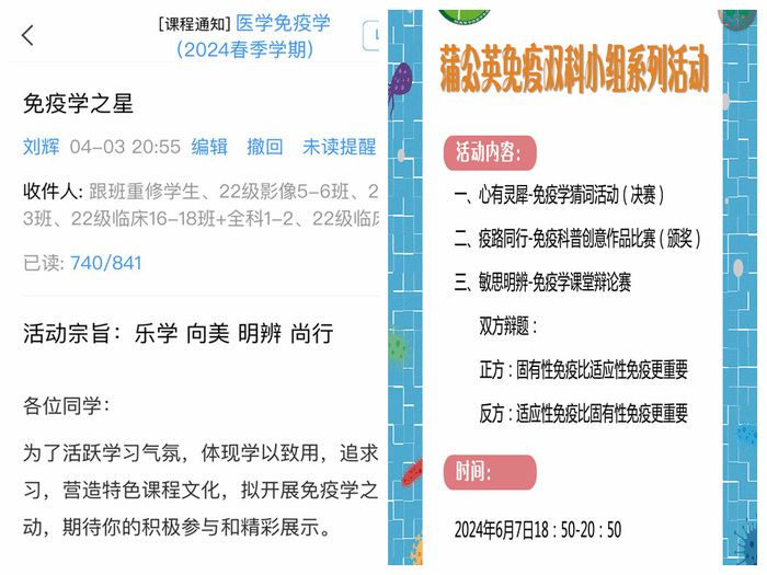 “免疫学之星”活动旨在鼓励学生“乐中学、做中学、辩中学”,从而激发学习热情,培养表达、批判、思辨能力和合作、创新、责任意识,以凸显一流课程的“两性一度”。今后,医学免疫学课程团队将持续开展丰富多样的第二课堂活动,努力营造“乐学、向美、明辨、尚行”的课程文化氛围。