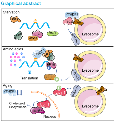 衰老是多种慢性疾病的主要风险因素,mTORC1信号通路作为营养感知和代谢调控的核心枢纽,在衰老过程中发挥关键作用。然而,其下游的蛋白质合成与胆固醇合成两条分支在衰老中的相对贡献尚不明确;同时,尽管RNA甲基化修饰(m6A)及其阅读蛋白YTHDF家族被广泛研究,它们在衰老调控中的作用机制仍不清楚。该研究不仅揭示了YTHDF1通过溶酶体定位调控mTORC1的全新功能,拓展了对m6A结合蛋白多功能性的认识,同时阐明了一条全新的“YTHDF1-mTORC1-SREBP2”衰老调控轴,为延缓衰老及干预年龄相关疾病提供了潜在新靶点。