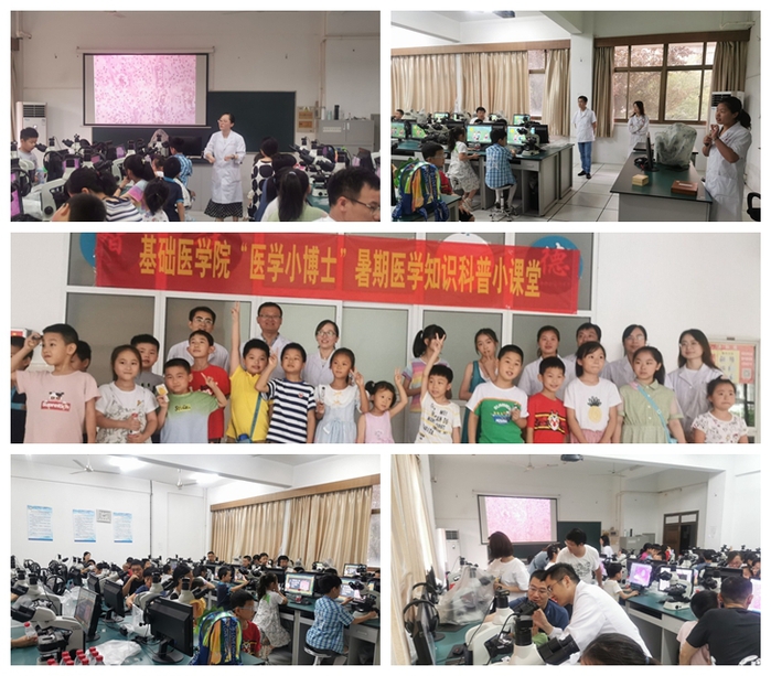 本届科普活动共有五期,旨在为我校教职工子女丰富暑假学习生活,提供一次近距离接触医学知识的机会,提升探索医学知识的浓厚兴趣。为保证活动质量,学院党委及相关支部提前两周就活动内容以及服务安全保障等工作进行了研究和安排。本次活动得到了我校各职能部门和教学单位职工的大力支持,参与人数达到了150余人次。活动现场,老师们通过图片讲解、实物模型认知以及简单的显微操作指导,形象生动的介绍了与日常生活息息相关的医学常识,台上老师语言严谨而风趣,台下小朋友们互动积极,态度认真、气氛热烈,取得了预期的成效。