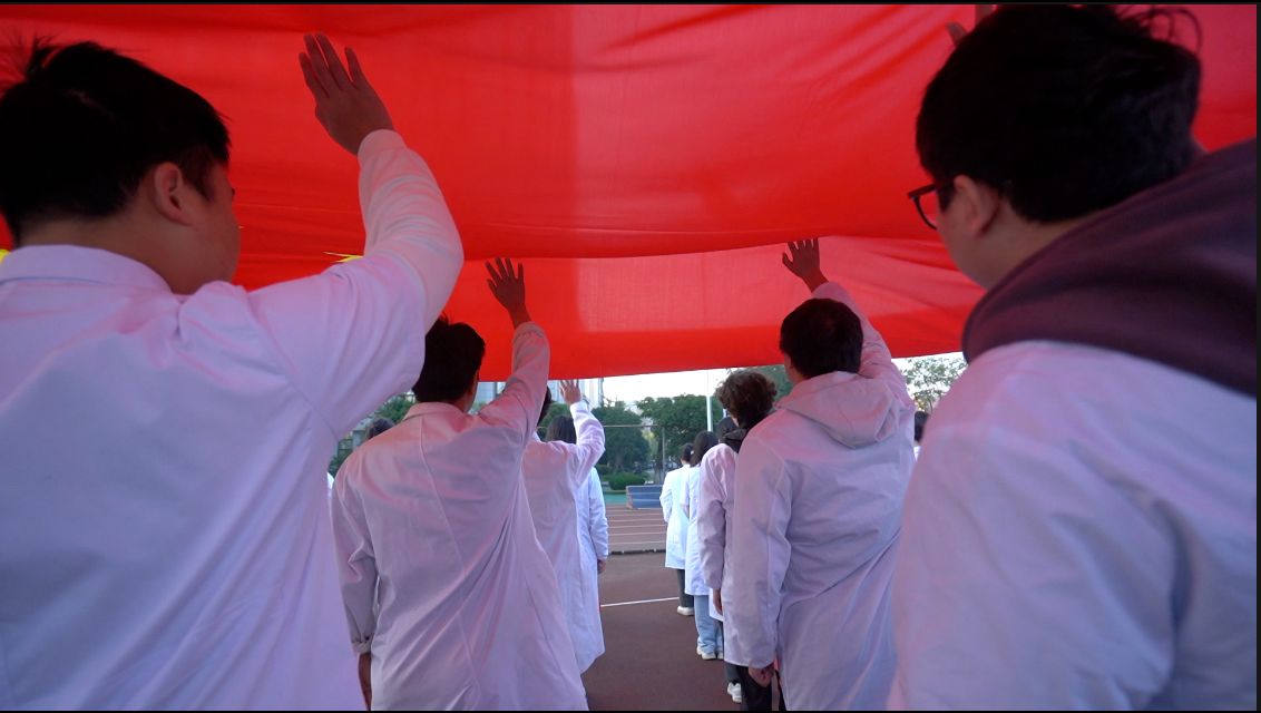 最后,同学们齐唱校歌,字字铿锵,歌声嘹亮。蓝天救援队队员持大国旗,缓缓地从师生们头顶上方划过,让大家尽情伸展双手抚摸,零距离接触国旗,感受国旗的力量,感受国家的力量!
