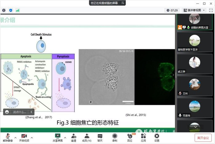 胡磊在博士学习阶段致力于细胞焦亡相关活化信号通路研究。细胞焦亡是一种Gasdermin蛋白家族介导的促炎性程序性细胞死亡方式,与GSDME的表达水平密切有关,即高表达诱导细胞发生焦亡,反之诱导凋亡。研究表明,化疗药物引起的细胞焦亡是BAK/BAX-caspase-3-GSDME信号通路依赖的,且以GSDME的棕榈酰化修饰来促进活化而引发。该研究结果为干预肿瘤发生发展提供了新策略。讲座内容丰富,构思精妙,汇报精彩,给与会者提供诸多科研思路与方法借鉴。