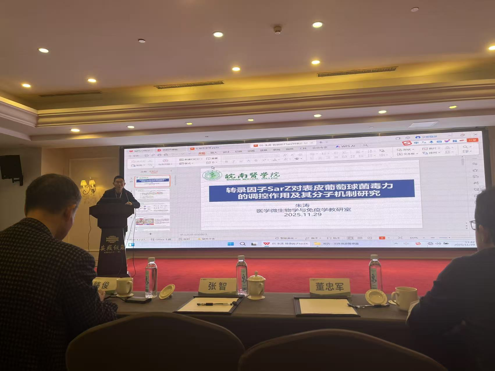 本次学术年会聚焦微生物学与免疫学的最新研究进展与发展趋势,特邀清华大学董忠军教授、中国疾病预防控制中心韩俊研究员、香港中文大学(深圳)医学院李丛磊教授作大会前沿报告。三位专家分别从巨噬细胞抗肿瘤新机制、传染病防控策略、抗体产生调控机制等角度分享了最新研究成果,为与会者带来了一场高水平的学术盛宴。会议期间,朱涛教授应邀作了题为《转录因子SarZ对表皮葡萄球菌毒力的调控作用及其分子机制研究》的学术报告,阐释了该转录因子通过调控表皮葡萄球菌生物膜形成与溶血活性,从而控制其“定植-侵袭”表型转换的分子机制。报告内容紧扣学科热点、逻辑严谨,受到与会专家和同行的高度认可与积极评价。