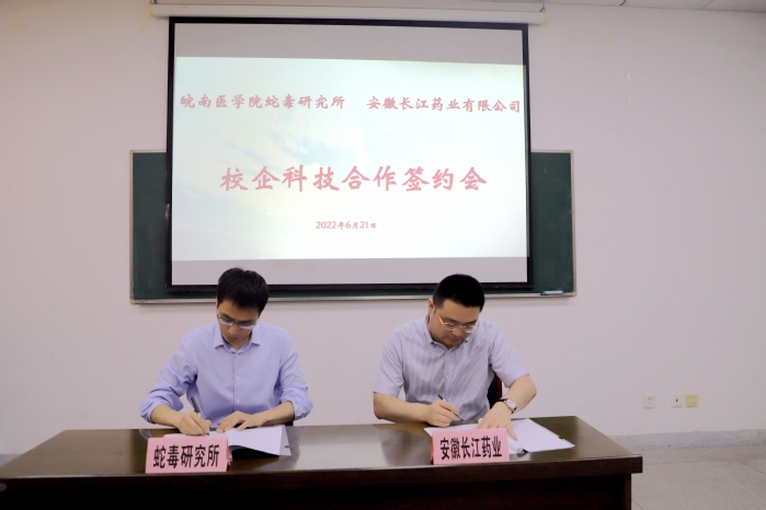 为深入拓宽校企合作途径,充分发挥校企产学研协同创新优势,6月21日上午,我校蛇毒蛇伤研究所和安徽长江药业有限公司在英国上市官网365会议室举行校企科技合作签约会。安徽长江药业有限公司总经理方进、总顾问端木于良,我校科研处处长朱再满、药学院院长韩军、英国上市官网365党委书记马旭明参加签约会。会议由蛇毒蛇伤研究所负责人李曙教授主持。