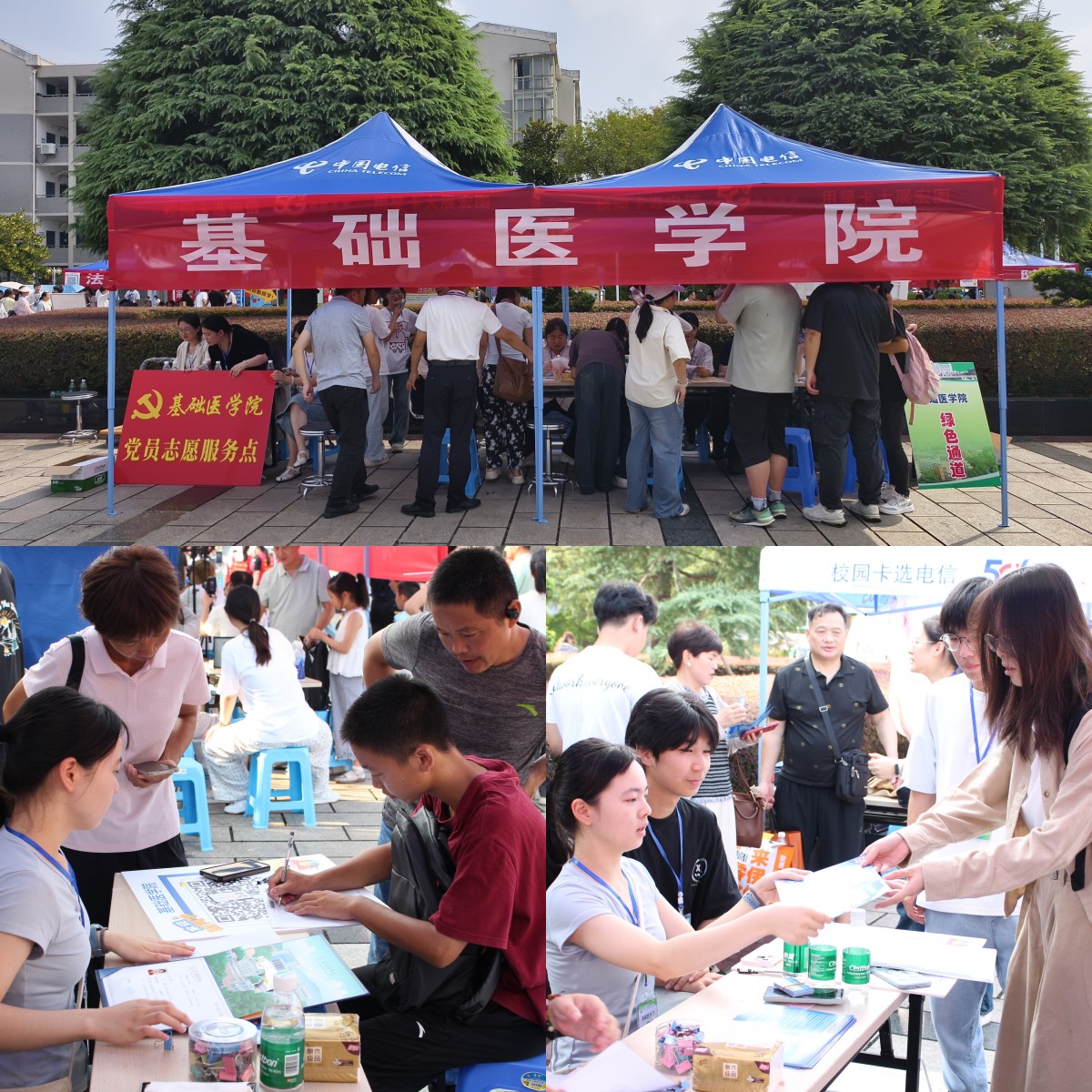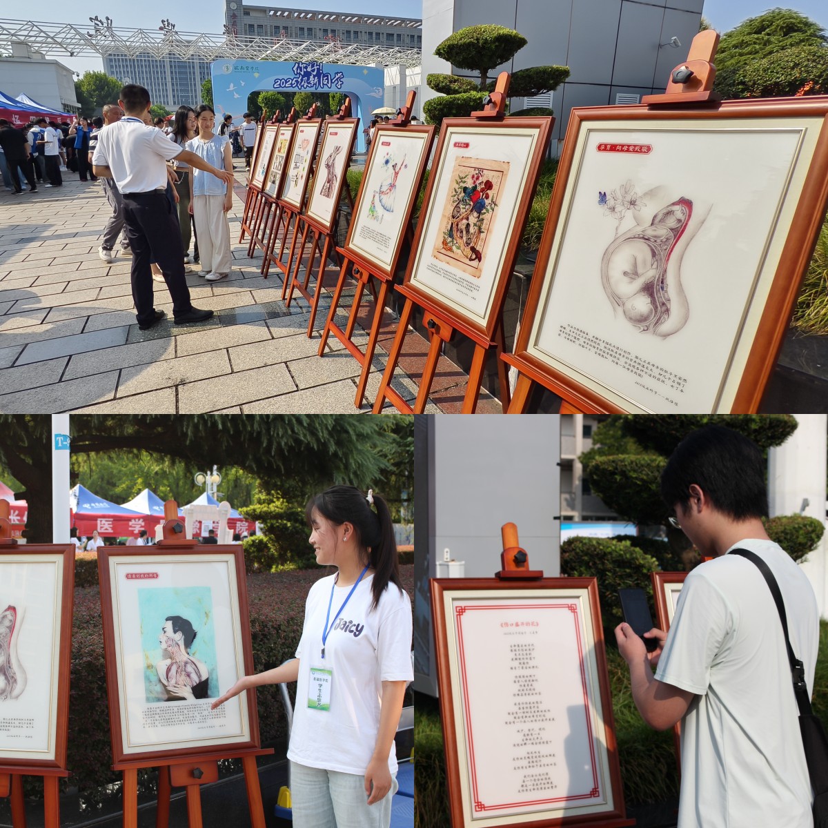 报到现场流程清晰、分工明确,志愿者学生穿梭在人群中,主动热情地为新生搬运行李、指引路线、答疑解惑,他们的精准引导和灿烂笑容成为迎新现场一道亮丽的风景线。学院的教师们耐心解答家长疑问,开展反诈宣传,提醒新生和家长们警惕诈骗陷阱,言语间充满关切,令人倍感安心。整个报到环节忙而不乱,各项工作有条不紊。学院特别设置了“基础医学优秀人文作品展”,展出学生创作的“人体解剖图谱”和“我与实验动物的故事”等,吸引了众多新生及家长驻足欣赏。这一特色展示不仅彰显了学院“科学精神与人文素养并重”的育人理念,更让新生初入校园便感受到医学的温度与厚度。