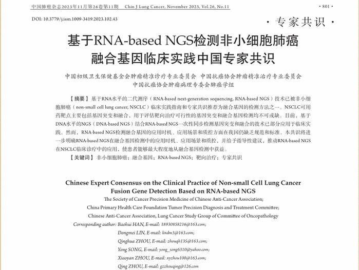 近日,我院病理解剖学教研室主任卢林明参与讨论和编写的《基于RNA-basedNGS检测非小细胞肺癌融合基因临床实践中国专家共识》(以下简称《共识》)正式见刊《中国肺癌杂志》,这是国内外指南共识中首次推荐采用DNA联合RNA共同检测非小细胞肺癌驱动基因的专家共识。