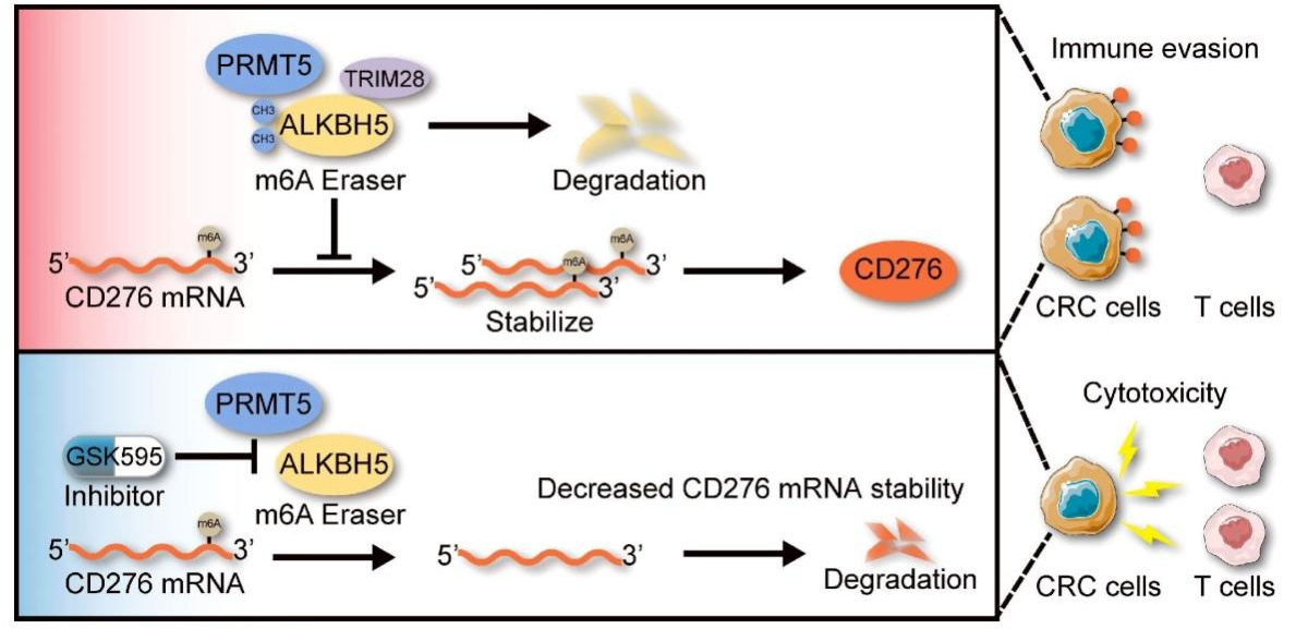 PRMT5是精氨酸甲基转移酶家族蛋白的重要成员之一,已有报道表明PRMT5能促进多种肿瘤的免疫逃逸作用,但PRMT5调控肿瘤免疫逃逸作用机制并不明确。该研究首先发现PRMT5能通过调控结直肠癌细胞的m6A修饰来增强结直肠癌的免疫逃逸作用。团队成员运用meRIP-Seq、RNA-Seq、质谱检测等分析方法,发现PRMT5催化m6A去甲基酶ALKBH5的R316位点发生对称性二甲基化修饰(meR316-ALKBH5),meR316-ALKBH5进一步被TRIM28泛素化降解,这导致ALKBH5对CD276转录本的m6A去甲基化作用减弱,从而引起CD276的m6A修饰增加并提升它的mRNA稳定性,最终导致免疫检查点蛋白CD276表达增多并促进结直肠肿瘤免疫逃逸。相关研究结果该团队在2024年11月以英国正版365为申请人已向国家知识产权局申报国家发明专利。