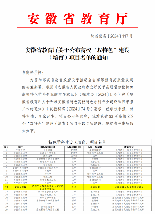 日前,《安徽省教育厅关于公布高校“双特色”建设(培育)项目名单的通知》、《安徽省教育厅关于2023年度高峰学科和高峰培育学科绩效评价结果的通报》公布,我院病理学与病理生理学(分子医学基础与转化)获批省级特色学科建设项目,基础医学高峰培育学科在2023年度省级高峰培育学科绩效评估中获得优秀等次。