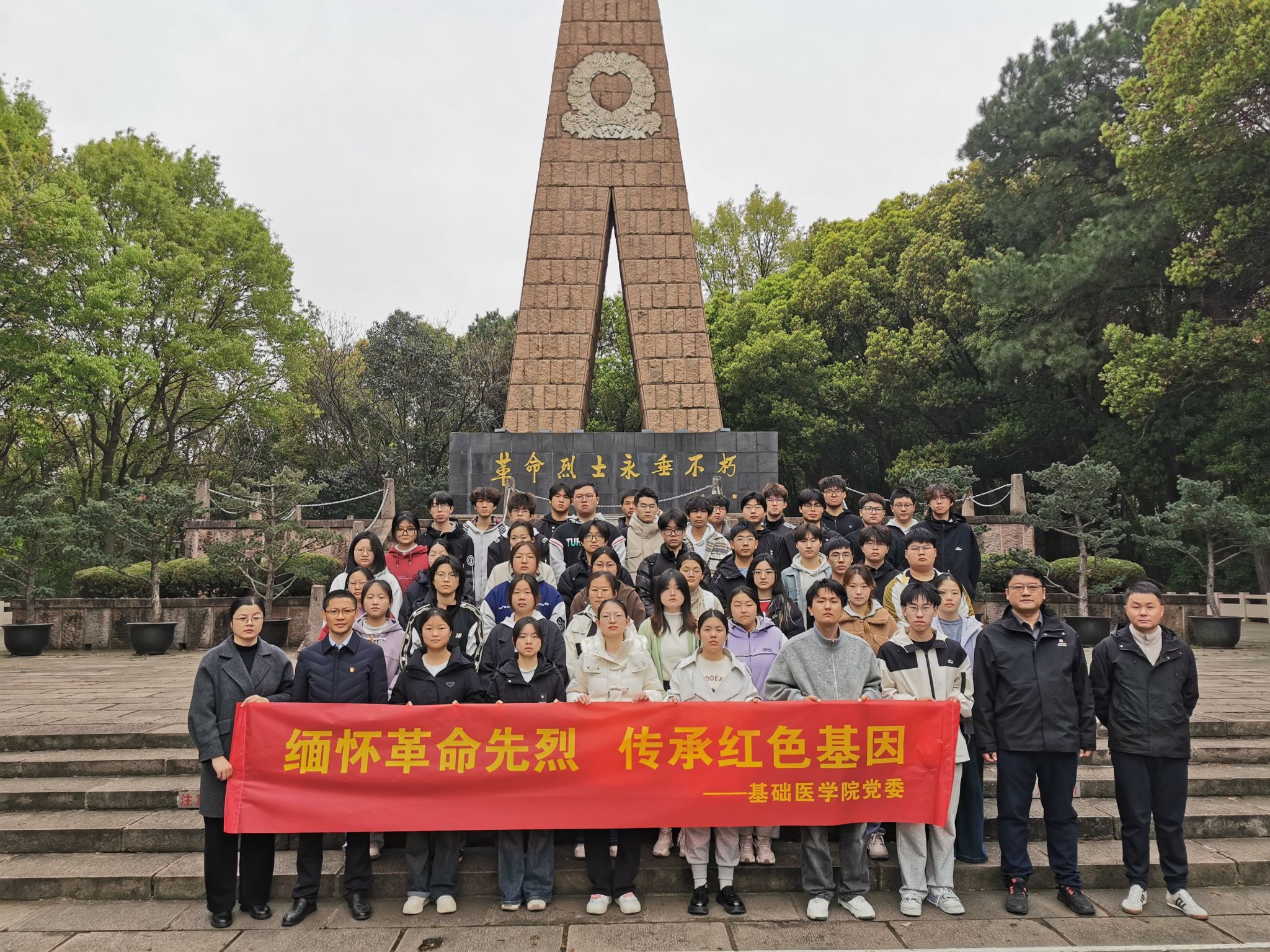 "我志愿加入中国共产党,拥护党的纲领,遵守党的章程……"在学院党委书记马旭明的带领下,全体教师党员面向烈士纪念碑重温入党誓词.23级基础医学1班团支部书记高胜男同学带领全体学生团员重温入团誓词。铿锵誓言在陵园上空回荡。在事迹陈列馆内,泛黄的家书、斑驳的军功章、复原的战斗场景让历史变得触手可及。