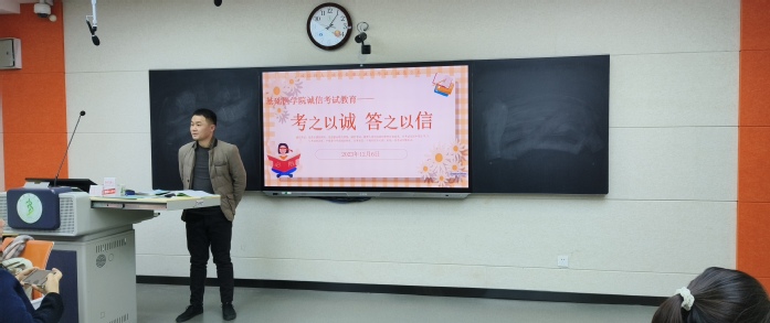 为提高学生诚信考试意识,做好英语四级和期末考试动员,12月6日晚,英国上市官网365在一号教学楼1206教室举行“考之以诚 答之以信”诚信考试主题班会,班会由学生辅导员卞显洋主持。