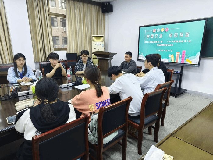 为进一步加强班级学风班风建设,培养良好班级学习氛围和习惯,增进学校不同专业之间的沟通与交流,4月17日晚,学院邀请21级临床医学1班学生干部和学生代表在英国上市官网365会议室举办“学风交流  班风互建”交流会,学院23级基础医学1班全体学生干部和寝室长参加交流,23级基础医学专业辅导员卞显洋主持交流会。
