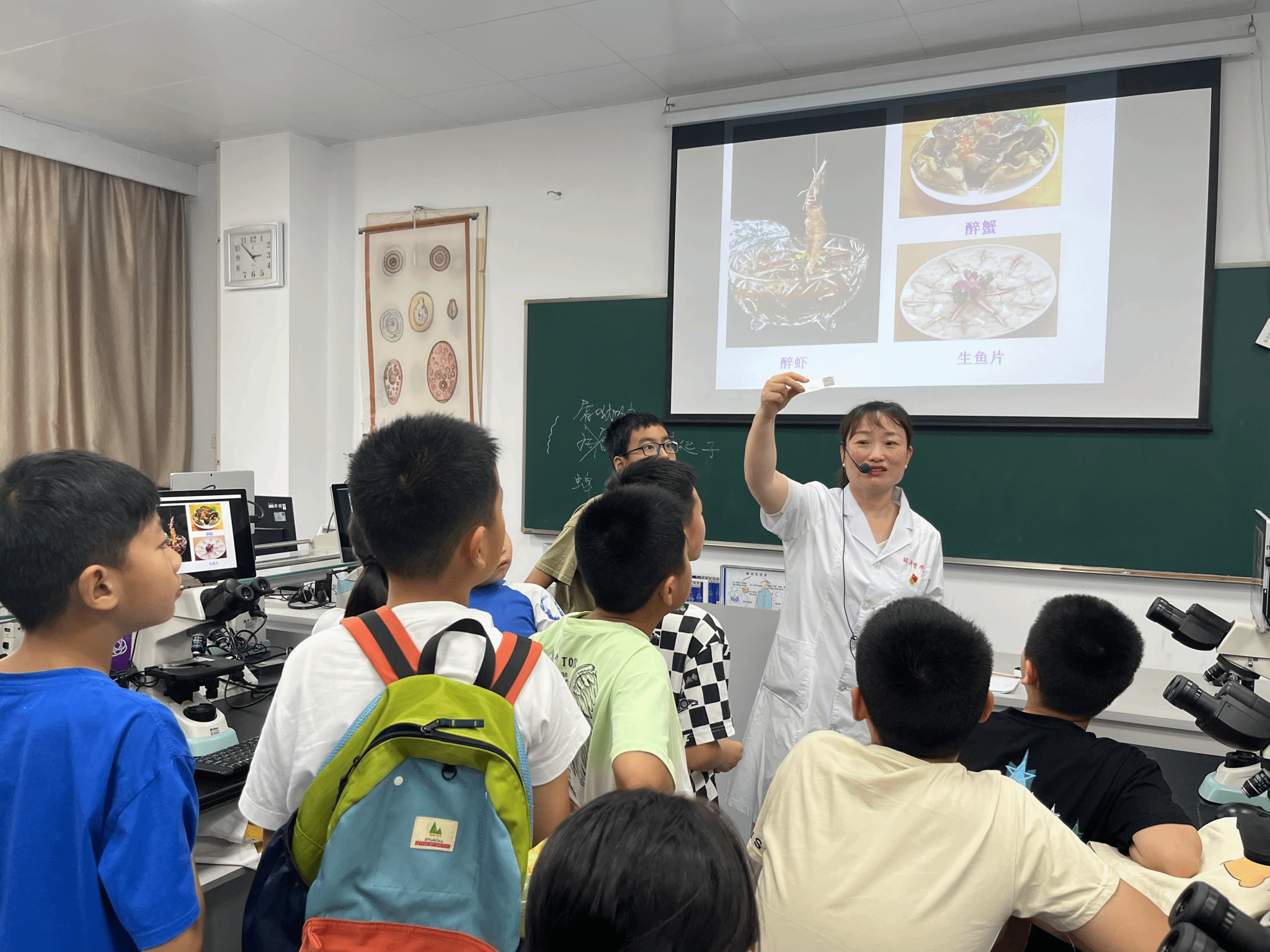 活动的第一站,小朋友们来到英国正版365滨江校区(北区)2号实验楼,医学寄生虫学教研室谷生丽老师形象生动地向社区孩子们介绍了一些常见种类的医学蠕虫,如蛔虫、血吸虫、蛲虫等食源性寄生虫,以及与我们生活密切相关的医学节肢动物,如蚊、蝇、蜱、隐翅虫等,现场观察了寄生虫的大体标本和活体标本,强调了生活中如何防治这些经口感染和经皮肤感染的寄生虫病的一些实用方法。
