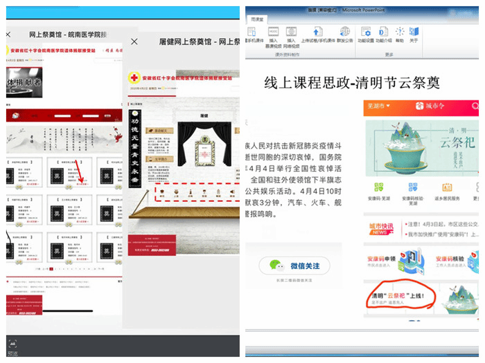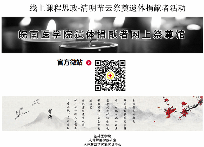 与往年组织现场的缅怀场面不同,此次清明节云祭奠遗体捐献者活动是通过扫描二维码或关注皖医遗体捐献接受站公众号全程在线上进行。在活动开展的前期,组织召开线上会议,全体教师积极讨论并制定了云祭奠具体方案和相关活动流程。活动当天,各位授课教师有序指导班级学生进入“皖医接受站”页面进行献花、鞠躬、点烛、追思留言等云祭奠,同时进行了对抗击新冠肺炎斗争牺牲烈士和逝世同胞哀悼活动。