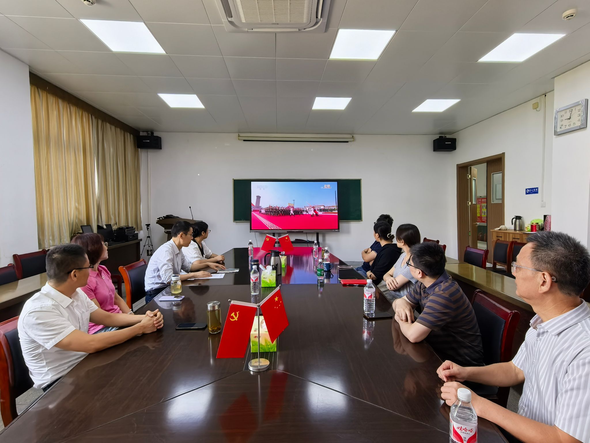 学院办公室和各党支部分别设置了集中观看点,组织师生进行集中观看。阅兵式上,45个方(梯)队依次通过天安门广场,涵盖空中护旗梯队、徒步方队、装备方队和空中梯队,展现了我国国防和军队现代化建设的辉煌成就。