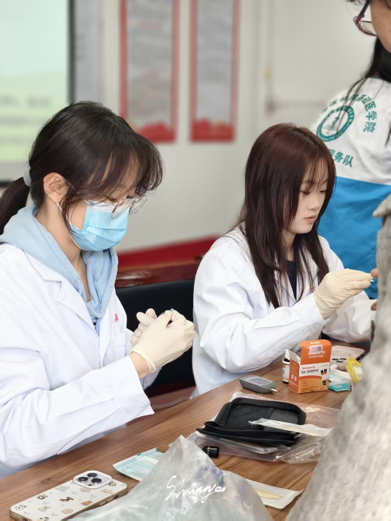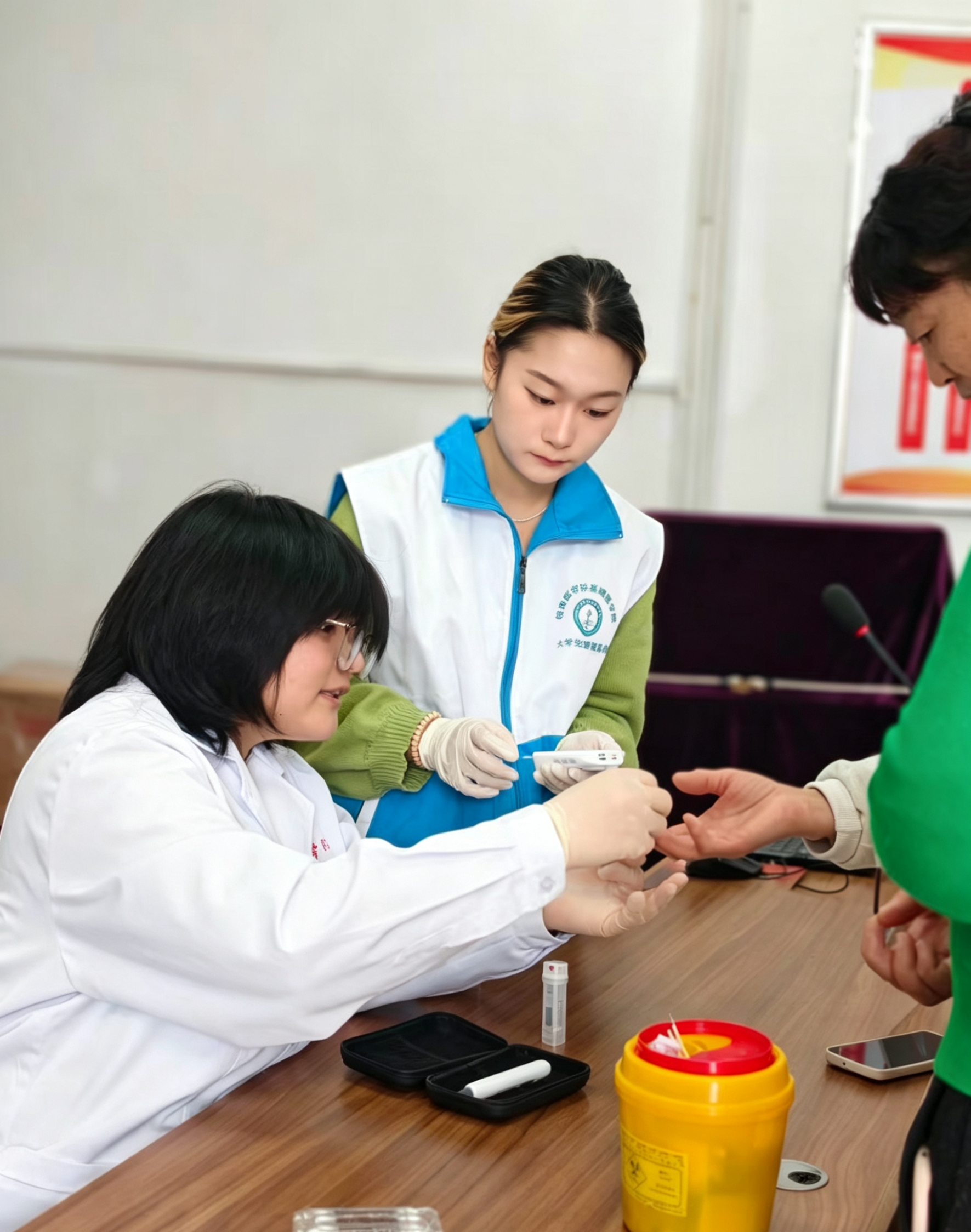 宣讲结束后,志愿者们还为社区居民现场进行了尿酸、血糖检测。大家遵守操作规范,完成检测、记录数据,并结合结果开展健康指导,对指标异常居民提出饮食、作息调整建议,叮嘱及时就医;对健康人群普及预防知识,强化日常防护意识。