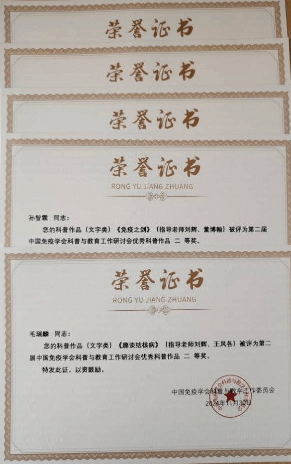 会议设报告、研讨、互动、颁奖等环节,会场气氛热烈。医学免疫学课程团队撰写的“一流课程背景下医学免疫学BOPPPS+混合式课程建设”论文被会议论文集收录。课程团队指导蒲公英免疫双科小组创作的科普作品被提交参加优秀科普作品评比,最终有六个作品被会议论文集收录;其中,临床医学专业学生孙智霖的科普小说“免疫之剑”、毛瑞麟的科普小品“趣谈结核病”获科普作品二等奖,另有三个科普作品获三等奖。