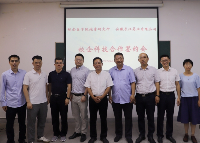为深入拓宽校企合作途径,充分发挥校企产学研协同创新优势,6月21日上午,我校蛇毒蛇伤研究所和安徽长江药业有限公司在英国上市官网365会议室举行校企科技合作签约会。安徽长江药业有限公司总经理方进、总顾问端木于良,我校科研处处长朱再满、药学院院长韩军、英国上市官网365党委书记马旭明参加签约会。会议由蛇毒蛇伤研究所负责人李曙教授主持。